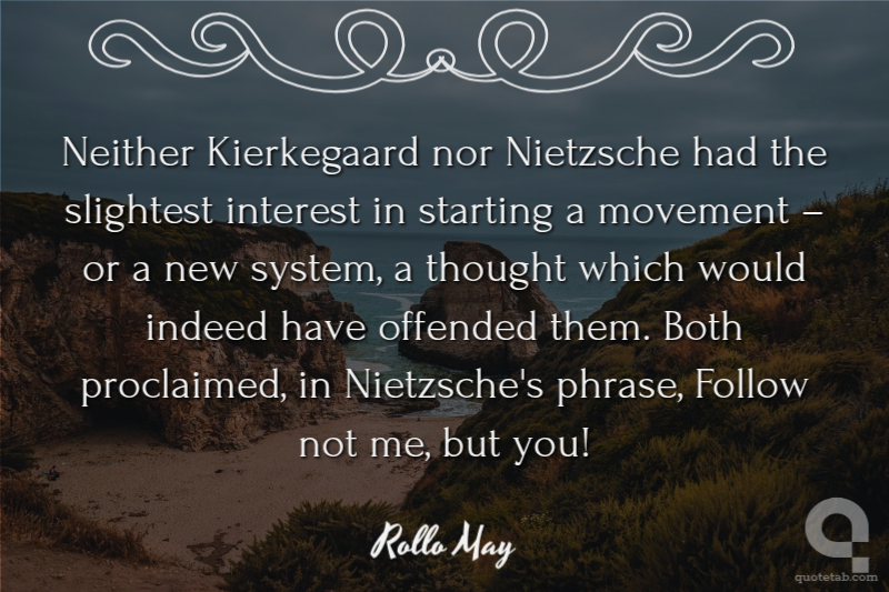 Neither Kierkegaard nor Nietzsche had the slightest interest in starting a movement – or a new system, a thought which would indeed have offended them. Both proclaimed, in Nietzsche's phrase, Follow not me, but you!