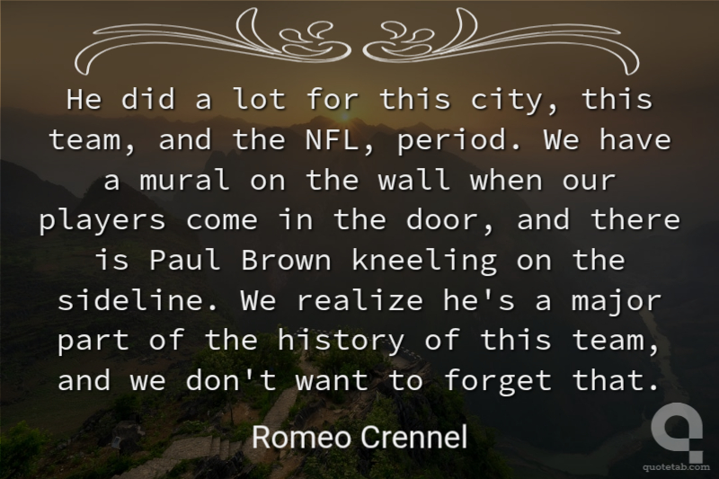 He did a lot for this city, this team, and the NFL, period. We have a mural on the wall when our players come in the door, and there is Paul Brown kneeling on the sideline. We realize he's a major part of the history of this team, and we don't want to forget that.