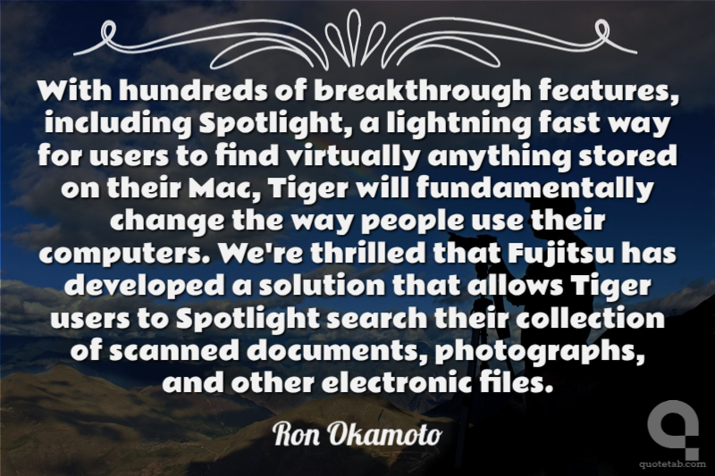 With hundreds of breakthrough features, including Spotlight, a lightning fast way for users to find virtually anything stored on their Mac, Tiger will fundamentally change the way people use their computers. We're thrilled that Fujitsu has developed a solution that allows Tiger users to Spotlight search their collection of scanned documents, photographs, and other electronic files.