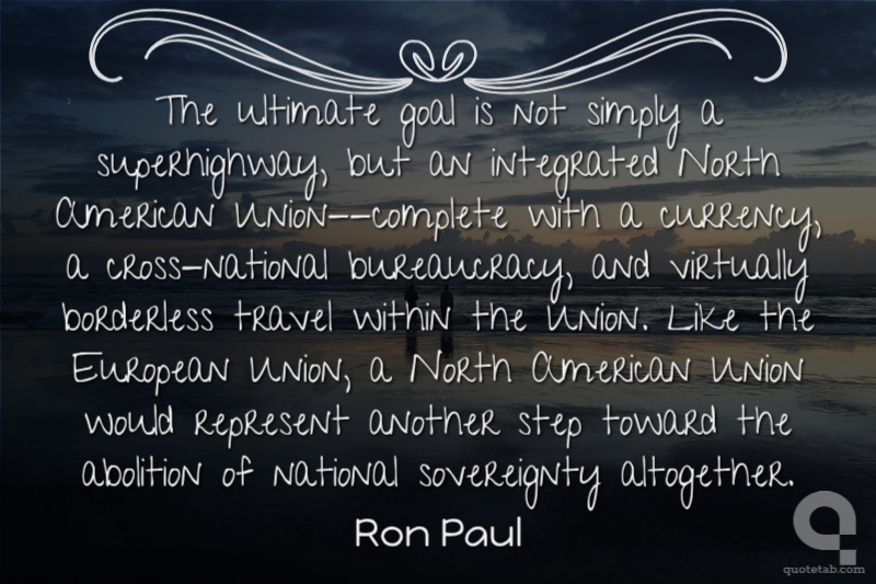 The ultimate goal is not simply a superhighway, but an integrated North American Union--complete with a currency, a cross-national bureaucracy, and virtually borderless travel within the Union. Like the European Union, a North American Union would represent another step toward the abolition of national sovereignty altogether.