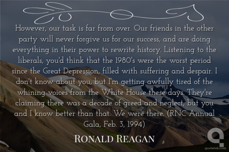 However, our task is far from over. Our friends in the other party will never forgive us for our success, and are doing everything in their power to rewrite history. Listening to the liberals, you'd think that the 1980's were the worst period since the Great Depression, filled with suffering and despair. I don't know about you, but I'm getting awfully tired of the whining voices from the White House these days. They're claiming there was a decade of greed and neglect, but you and I know better than that. We were there. (RNC Annual Gala, Feb. 3, 1994)