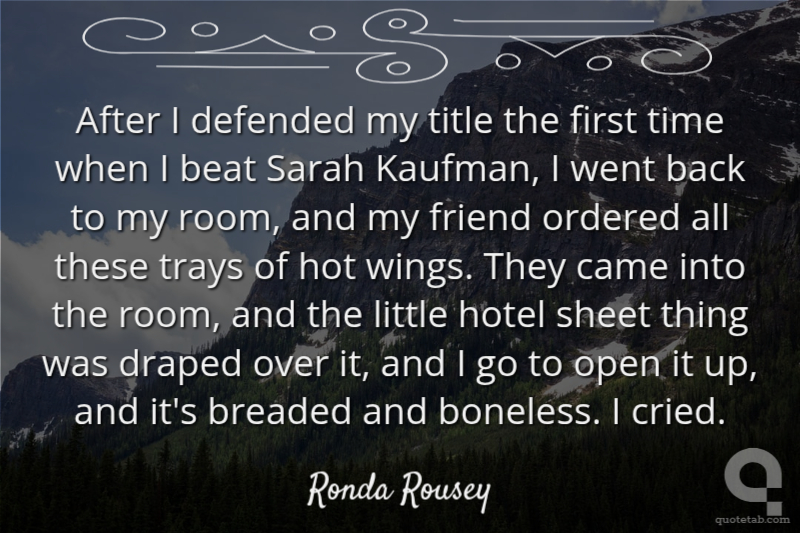 After I defended my title the first time when I beat Sarah Kaufman, I went back to my room, and my friend ordered all these trays of hot wings. They came into the room, and the little hotel sheet thing was draped over it, and I go to open it up, and it's breaded and boneless. I cried.