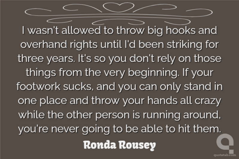 I wasn't allowed to throw big hooks and overhand rights until I'd been striking for three years. It's so you don't rely on those things from the very beginning. If your footwork sucks, and you can only stand in one place and throw your hands all crazy while the other person is running around, you're never going to be able to hit them.
