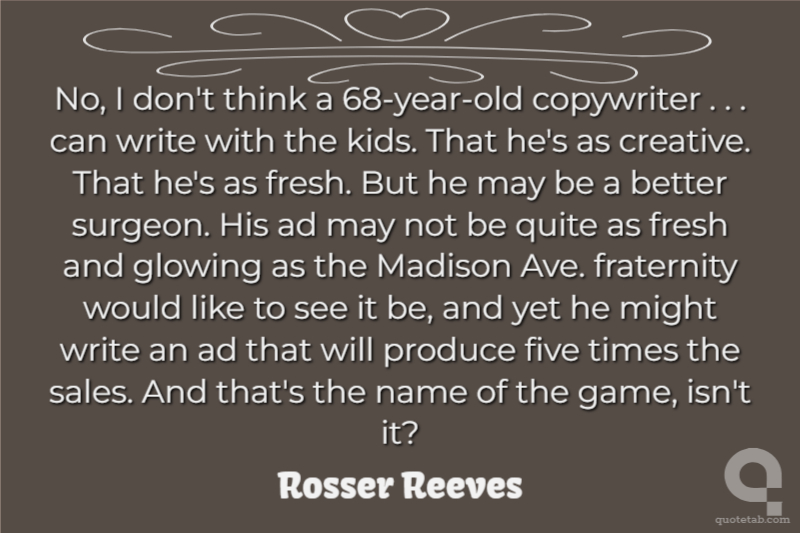 No, I don't think a 68-year-old copywriter . . . can write with the kids. That he's as creative. That he's as fresh. But he may be a better surgeon. His ad may not be quite as fresh and glowing as the Madison Ave. fraternity would like to see it be, and yet he might write an ad that will produce five times the sales. And that's the name of the game, isn't it?