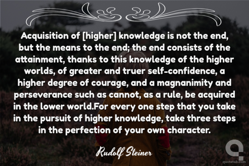Acquisition of [higher] knowledge is not the end, but the means to the end; the end consists of the attainment, thanks to this knowledge of the higher worlds, of greater and truer self-confidence, a higher degree of courage, and a magnanimity and perseverance such as cannot, as a rule, be acquired in the lower world.For every one step that you take in the pursuit of higher knowledge, take three steps in the perfection of your own character.