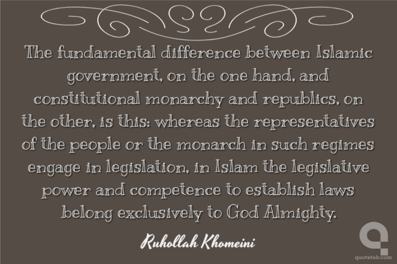 The fundamental difference between Islamic government, on the one hand, and constitutional monarchy and republics, on the other, is this: whereas the representatives of the people or the monarch in such regimes engage in legislation, in Islam the legislative power and competence to establish laws belong exclusively to God Almighty.