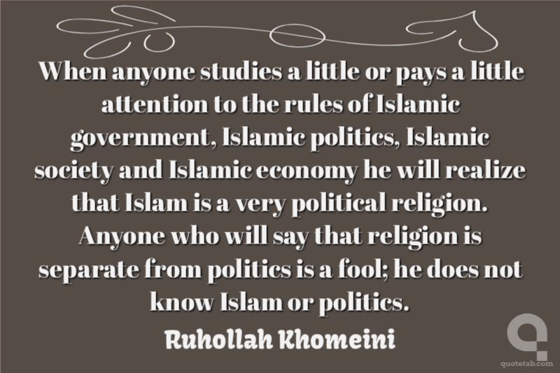 When anyone studies a little or pays a little attention to the rules of Islamic government, Islamic politics, Islamic society and Islamic economy he will realize that Islam is a very political religion. Anyone who will say that religion is separate from politics is a fool; he does not know Islam or politics.