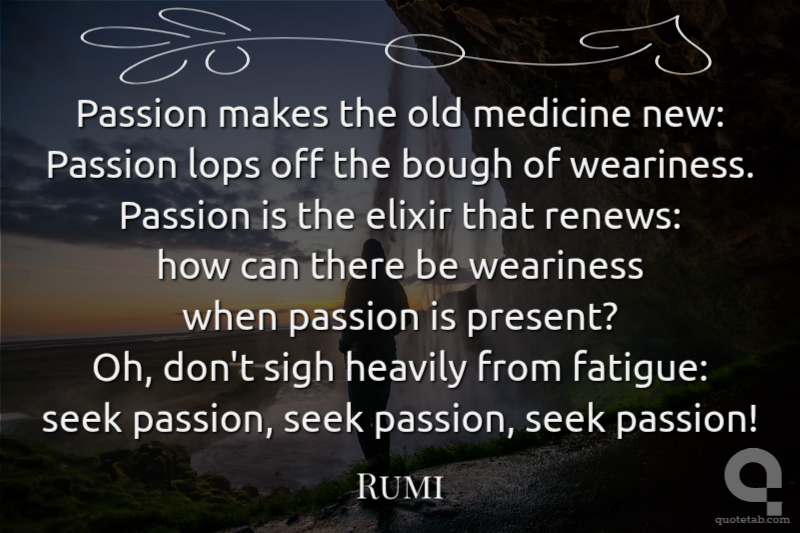 Passion makes the old medicine new: Passion lops off the bough of weariness. Passion is the elixir that renews: how can there be weariness when passion is present? Oh, don't sigh heavily from fatigue: seek passion, seek passion, seek passion!