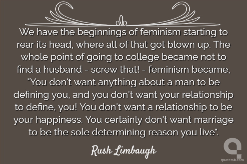We have the beginnings of feminism starting to rear its head, where all of that got blown up. The whole point of going to college became not to find a husband - screw that! - feminism became, "You don't want anything about a man to be defining you, and you don't want your relationship to define, you! You don't want a relationship to be your happiness. You certainly don't want marriage to be the sole determining reason you live".