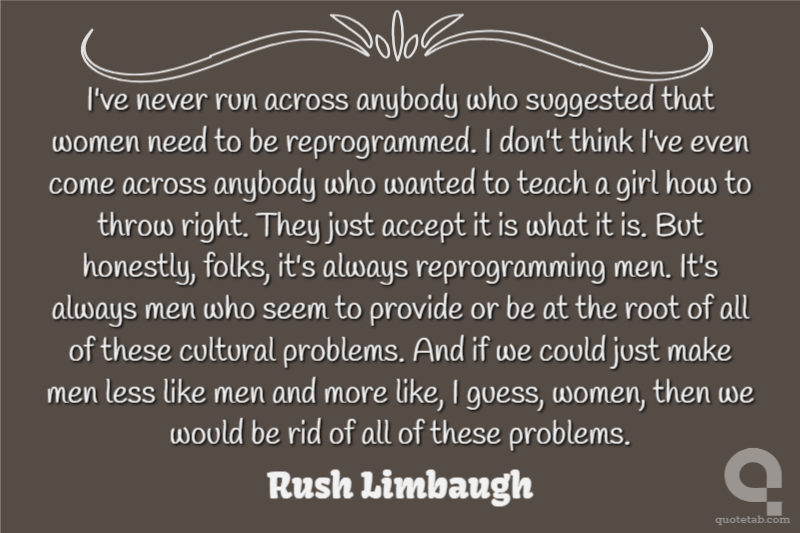 I've never run across anybody who suggested that women need to be reprogrammed. I don't think I've even come across anybody who wanted to teach a girl how to throw right. They just accept it is what it is. But honestly, folks, it's always reprogramming men. It's always men who seem to provide or be at the root of all of these cultural problems. And if we could just make men less like men and more like, I guess, women, then we would be rid of all of these problems.