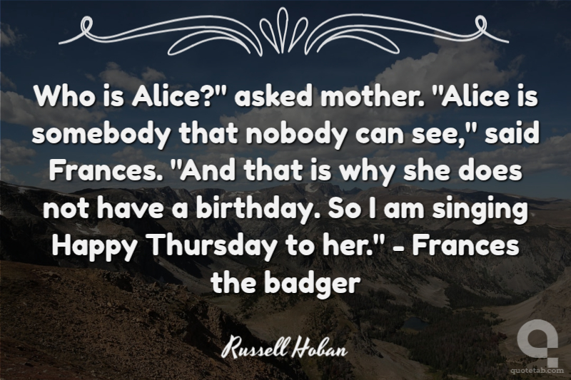 Who is Alice?" asked mother. "Alice is somebody that nobody can see," said Frances. "And that is why she does not have a birthday. So I am singing Happy Thursday to her." - Frances the badger