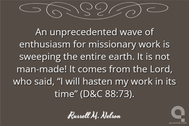An unprecedented wave of enthusiasm for missionary work is sweeping the entire earth. It is not man-made! It comes from the Lord, who said, “I will hasten my work in its time” (D&C 88:73).