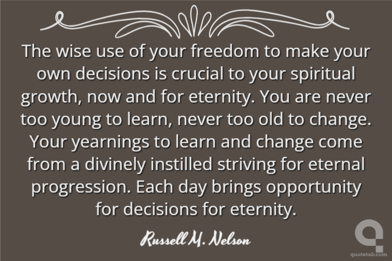 The wise use of your freedom to make your own decisions is crucial to your spiritual growth, now and for eternity. You are never too young to learn, never too old to change. Your yearnings to learn and change come from a divinely instilled striving for eternal progression. Each day brings opportunity for decisions for eternity.