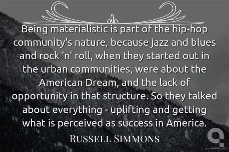 Being materialistic is part of the hip-hop community's nature, because jazz and blues and rock 'n' roll, when they started out in the urban communities, were about the American Dream, and the lack of opportunity in that structure. So they talked about everything - uplifting and getting what is perceived as success in America.