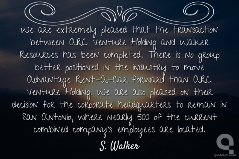 We are extremely pleased that the transaction between ARC Venture Holding and Walker Resources has been completed. There is no group better positioned in the industry to move Advantage Rent-A-Car forward than ARC Venture Holding. We are also pleased on their decision for the corporate headquarters to remain in San Antonio, where nearly 500 of the current combined company's employees are located.