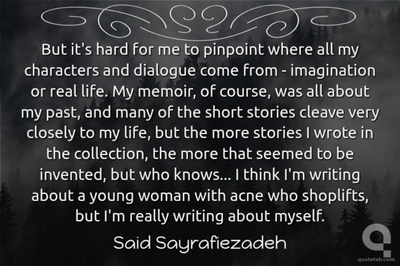 But it's hard for me to pinpoint where all my characters and dialogue come from - imagination or real life. My memoir, of course, was all about my past, and many of the short stories cleave very closely to my life, but the more stories I wrote in the collection, the more that seemed to be invented, but who knows... I think I'm writing about a young woman with acne who shoplifts, but I'm really writing about myself.