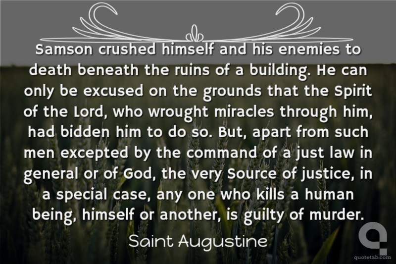 Samson crushed himself and his enemies to death beneath the ruins of a building. He can only be excused on the grounds that the Spirit of the Lord, who wrought miracles through him, had bidden him to do so. But, apart from such men excepted by the command of a just law in general or of God, the very Source of justice, in a special case, any one who kills a human being, himself or another, is guilty of murder.