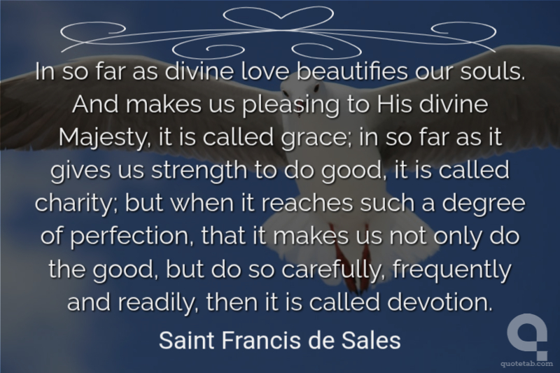In so far as divine love beautifies our souls. And makes us pleasing to His divine Majesty, it is called grace; in so far as it gives us strength to do good, it is called charity; but when it reaches such a degree of perfection, that it makes us not only do the good, but do so carefully, frequently and readily, then it is called devotion.