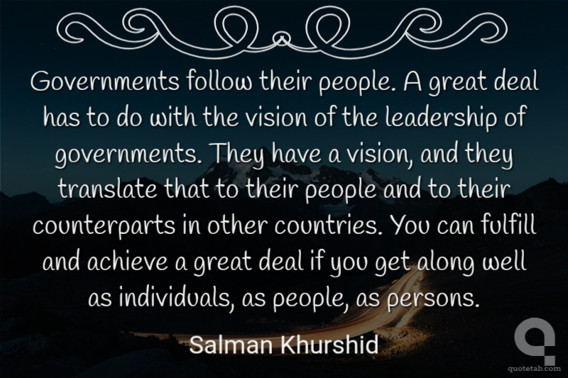 Governments follow their people. A great deal has to do with the vision of the leadership of governments. They have a vision, and they translate that to their people and to their counterparts in other countries. You can fulfill and achieve a great deal if you get along well as individuals, as people, as persons.