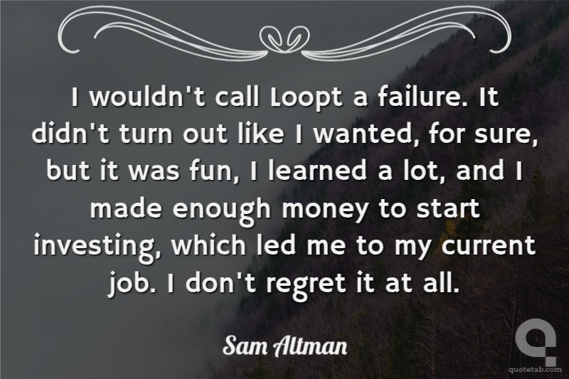 I wouldn't call Loopt a failure. It didn't turn out like I wanted, for sure, but it was fun, I learned a lot, and I made enough money to start investing, which led me to my current job. I don't regret it at all.