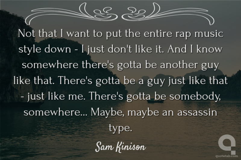 Not that I want to put the entire rap music style down - I just don't like it. And I know somewhere there's gotta be another guy like that. There's gotta be a guy just like that - just like me. There's gotta be somebody, somewhere... Maybe, maybe an assassin type.