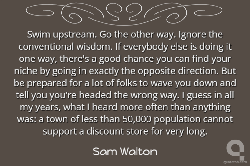 Swim upstream. Go the other way. Ignore the conventional wisdom. If everybody else is doing it one way, there's a good chance you can find your niche by going in exactly the opposite direction. But be prepared for a lot of folks to wave you down and tell you you're headed the wrong way. I guess in all my years, what I heard more often than anything was: a town of less than 50,000 population cannot support a discount store for very long.