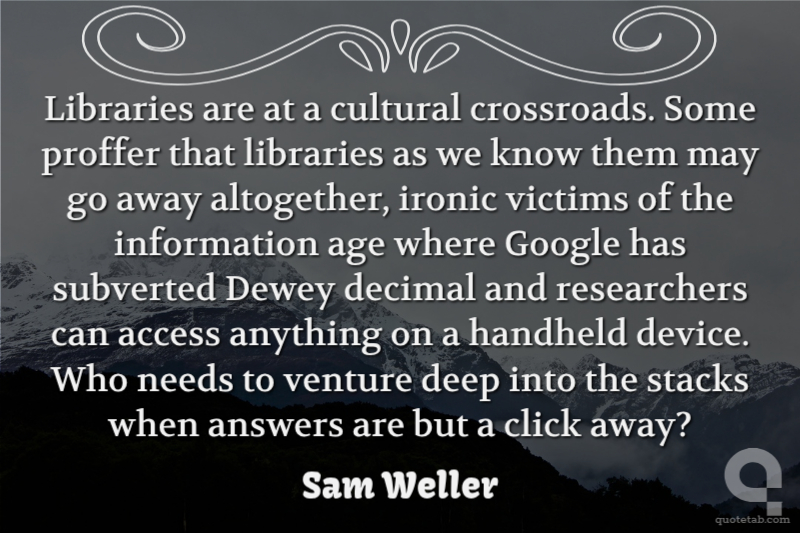 Libraries are at a cultural crossroads. Some proffer that libraries as we know them may go away altogether, ironic victims of the information age where Google has subverted Dewey decimal and researchers can access anything on a handheld device. Who needs to venture deep into the stacks when answers are but a click away?
