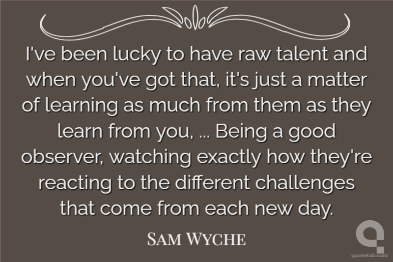 I've been lucky to have raw talent and when you've got that, it's just a matter of learning as much from them as they learn from you, ... Being a good observer, watching exactly how they're reacting to the different challenges that come from each new day.