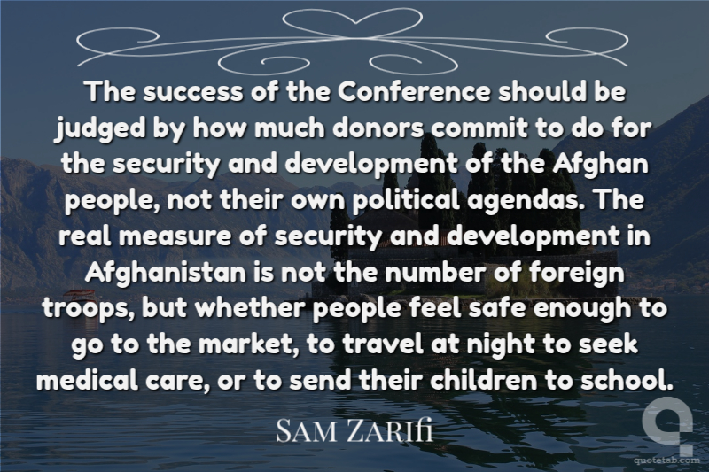 The success of the Conference should be judged by how much donors commit to do for the security and development of the Afghan people, not their own political agendas. The real measure of security and development in Afghanistan is not the number of foreign troops, but whether people feel safe enough to go to the market, to travel at night to seek medical care, or to send their children to school.
