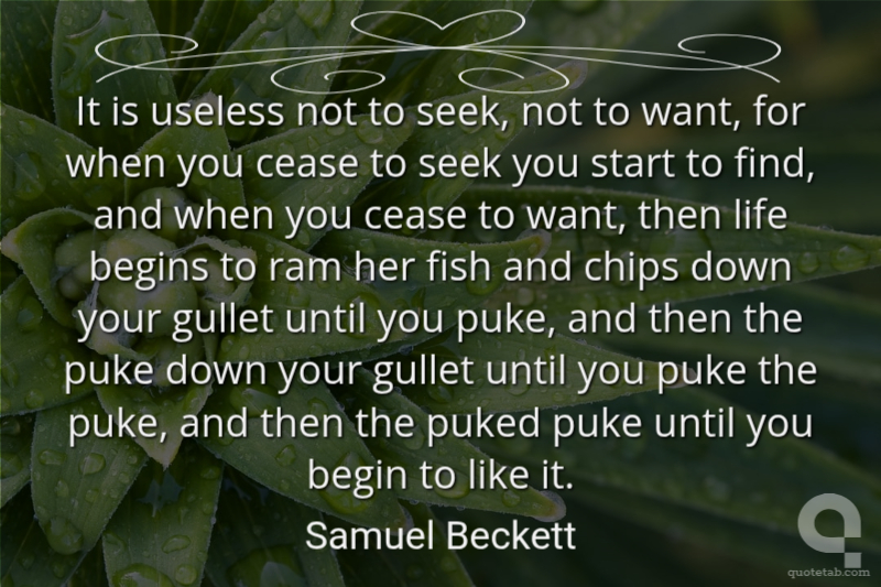It is useless not to seek, not to want, for when you cease to seek you start to find, and when you cease to want, then life begins to ram her fish and chips down your gullet until you puke, and then the puke down your gullet until you puke the puke, and then the puked puke until you begin to like it.