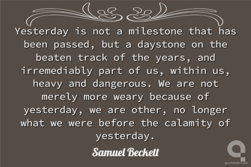 Yesterday is not a milestone that has been passed, but a daystone on the beaten track of the years, and irremediably part of us, within us, heavy and dangerous. We are not merely more weary because of yesterday, we are other, no longer what we were before the calamity of yesterday.