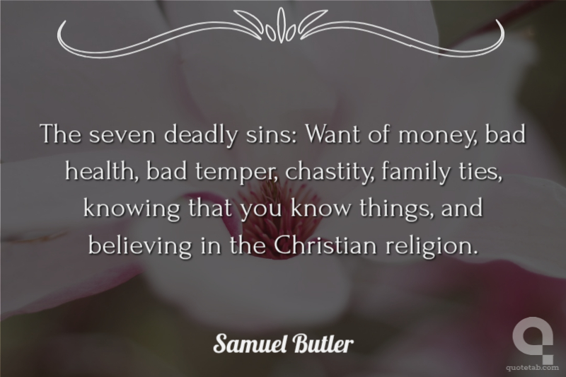The seven deadly sins: Want of money, bad health, bad temper, chastity, family ties, knowing that you know things, and believing in the Christian religion.