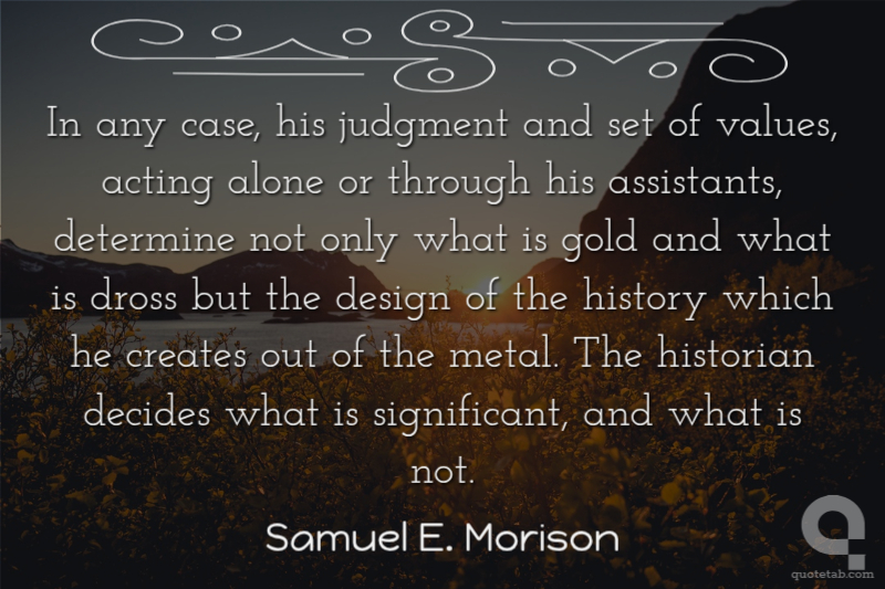 In any case, his judgment and set of values, acting alone or through his assistants, determine not only what is gold and what is dross but the design of the history which he creates out of the metal. The historian decides what is significant, and what is not.