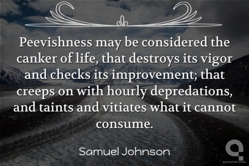 Peevishness may be considered the canker of life, that destroys its vigor and checks its improvement; that creeps on with hourly depredations, and taints and vitiates what it cannot consume.
