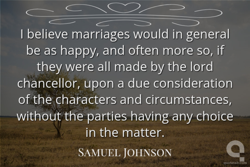 I believe marriages would in general be as happy, and often more so, if they were all made by the lord chancellor, upon a due consideration of the characters and circumstances, without the parties having any choice in the matter.