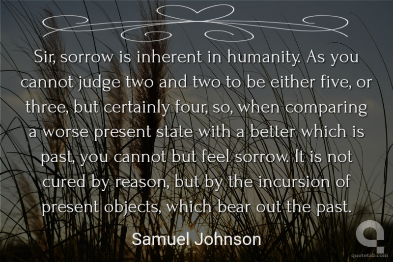 Sir, sorrow is inherent in humanity. As you cannot judge two and two to be either five, or three, but certainly four, so, when comparing a worse present state with a better which is past, you cannot but feel sorrow. It is not cured by reason, but by the incursion of present objects, which bear out the past.