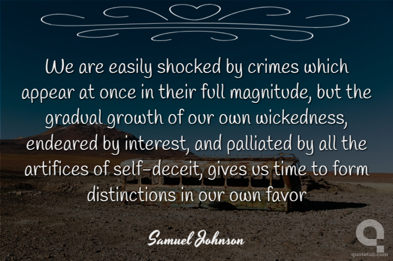 We are easily shocked by crimes which appear at once in their full magnitude, but the gradual growth of our own wickedness, endeared by interest, and palliated by all the artifices of self-deceit, gives us time to form distinctions in our own favor
