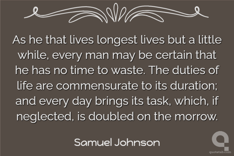 As he that lives longest lives but a little while, every man may be certain that he has no time to waste. The duties of life are commensurate to its duration; and every day brings its task, which, if neglected, is doubled on the morrow.