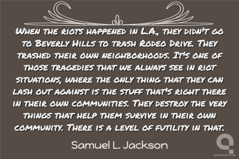 When the riots happened in L.A., they didn't go to Beverly Hills to trash Rodeo Drive. They trashed their own neighborhoods. It's one of those tragedies that we always see in riot situations, where the only thing that they can lash out against is the stuff that's right there in their own communities. They destroy the very things that help them survive in their own community. There is a level of futility in that.