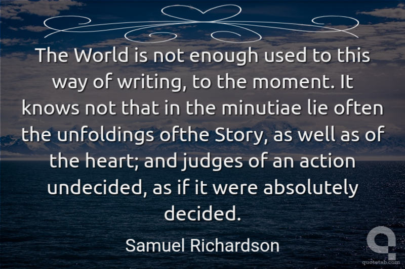 The World is not enough used to this way of writing, to the moment. It knows not that in the minutiae lie often the unfoldings ofthe Story, as well as of the heart; and judges of an action undecided, as if it were absolutely decided.