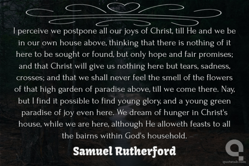 I perceive we postpone all our joys of Christ, till He and we be in our own house above, thinking that there is nothing of it here to be sought or found, but only hope and fair promises; and that Christ will give us nothing here but tears, sadness, crosses; and that we shall never feel the smell of the flowers of that high garden of paradise above, till we come there. Nay, but I find it possible to find young glory, and a young green paradise of joy even here. We dream of hunger in Christ's house, while we are here, although He alloweth feasts to all the bairns within God's household.