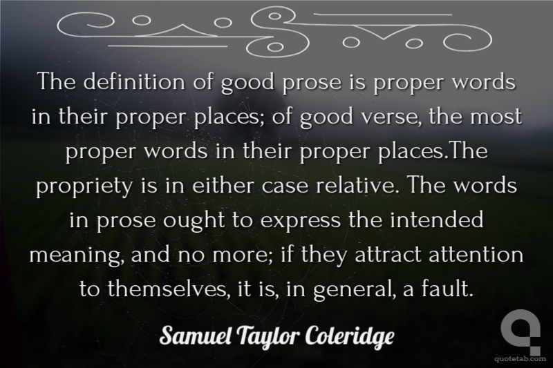 The definition of good prose is proper words in their proper places; of good verse, the most proper words in their proper places.The propriety is in either case relative. The words in prose ought to express the intended meaning, and no more; if they attract attention to themselves, it is, in general, a fault.