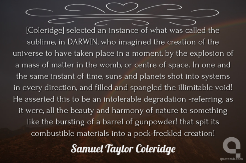 [Coleridge] selected an instance of what was called the sublime, in DARWIN, who imagined the creation of the universe to have taken place in a moment, by the explosion of a mass of matter in the womb, or centre of space. In one and the same instant of time, suns and planets shot into systems in every direction, and filled and spangled the illimitable void! He asserted this to be an intolerable degradation -referring, as it were, all the beauty and harmony of nature to something like the bursting of a barrel of gunpowder! that spit its combustible materials into a pock-freckled creation!