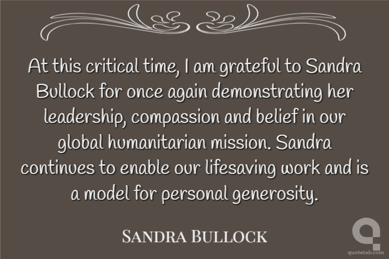 At this critical time, I am grateful to Sandra Bullock for once again demonstrating her leadership, compassion and belief in our global humanitarian mission. Sandra continues to enable our lifesaving work and is a model for personal generosity.