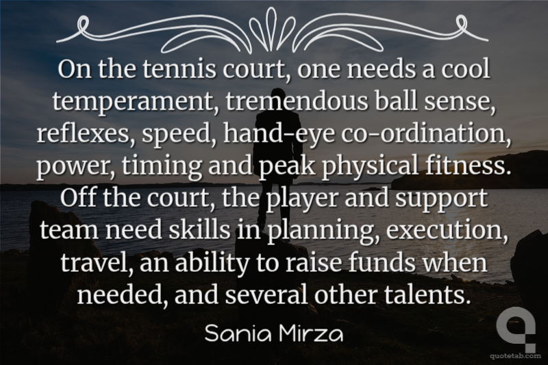 On the tennis court, one needs a cool temperament, tremendous ball sense, reflexes, speed, hand-eye co-ordination, power, timing and peak physical fitness. Off the court, the player and support team need skills in planning, execution, travel, an ability to raise funds when needed, and several other talents.