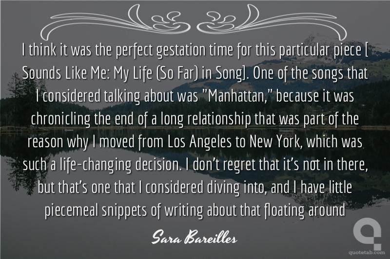 I think it was the perfect gestation time for this particular piece [ Sounds Like Me: My Life (So Far) in Song]. One of the songs that I considered talking about was "Manhattan," because it was chronicling the end of a long relationship that was part of the reason why I moved from Los Angeles to New York, which was such a life-changing decision. I don't regret that it's not in there, but that's one that I considered diving into, and I have little piecemeal snippets of writing about that floating around