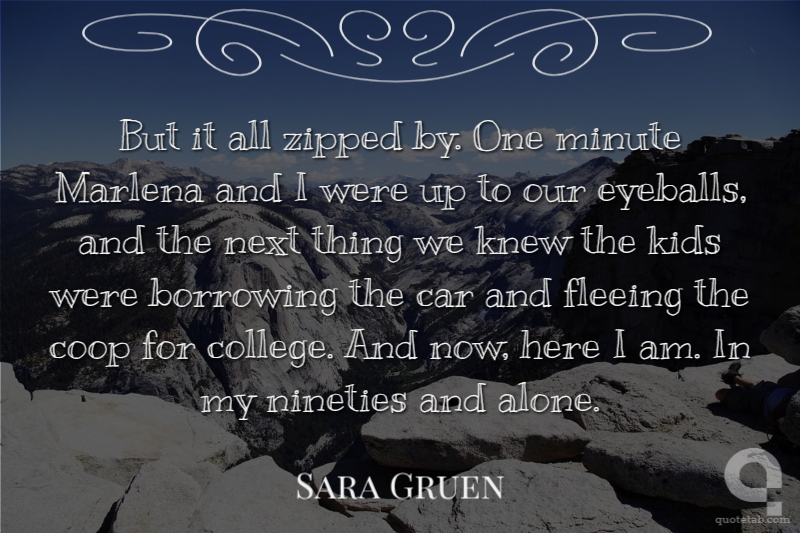 But it all zipped by. One minute Marlena and I were up to our eyeballs, and the next thing we knew the kids were borrowing the car and fleeing the coop for college. And now, here I am. In my nineties and alone.