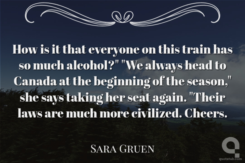 How is it that everyone on this train has so much alcohol?" "We always head to Canada at the beginning of the season," she says taking her seat again. "Their laws are much more civilized. Cheers.