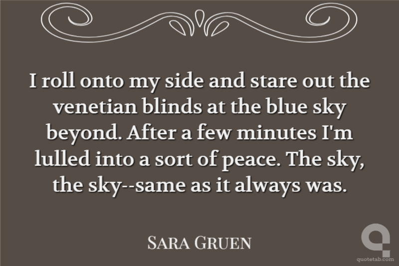 I roll onto my side and stare out the venetian blinds at the blue sky beyond. After a few minutes I'm lulled into a sort of peace. The sky, the sky--same as it always was.