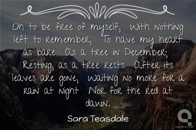 Oh to be free of myself, With nothing left to remember, To have my heart as bare As a tree in December; Resting, as a tree rests After its leaves are gone, Waiting no more for a rain at night Nor for the red at dawn.